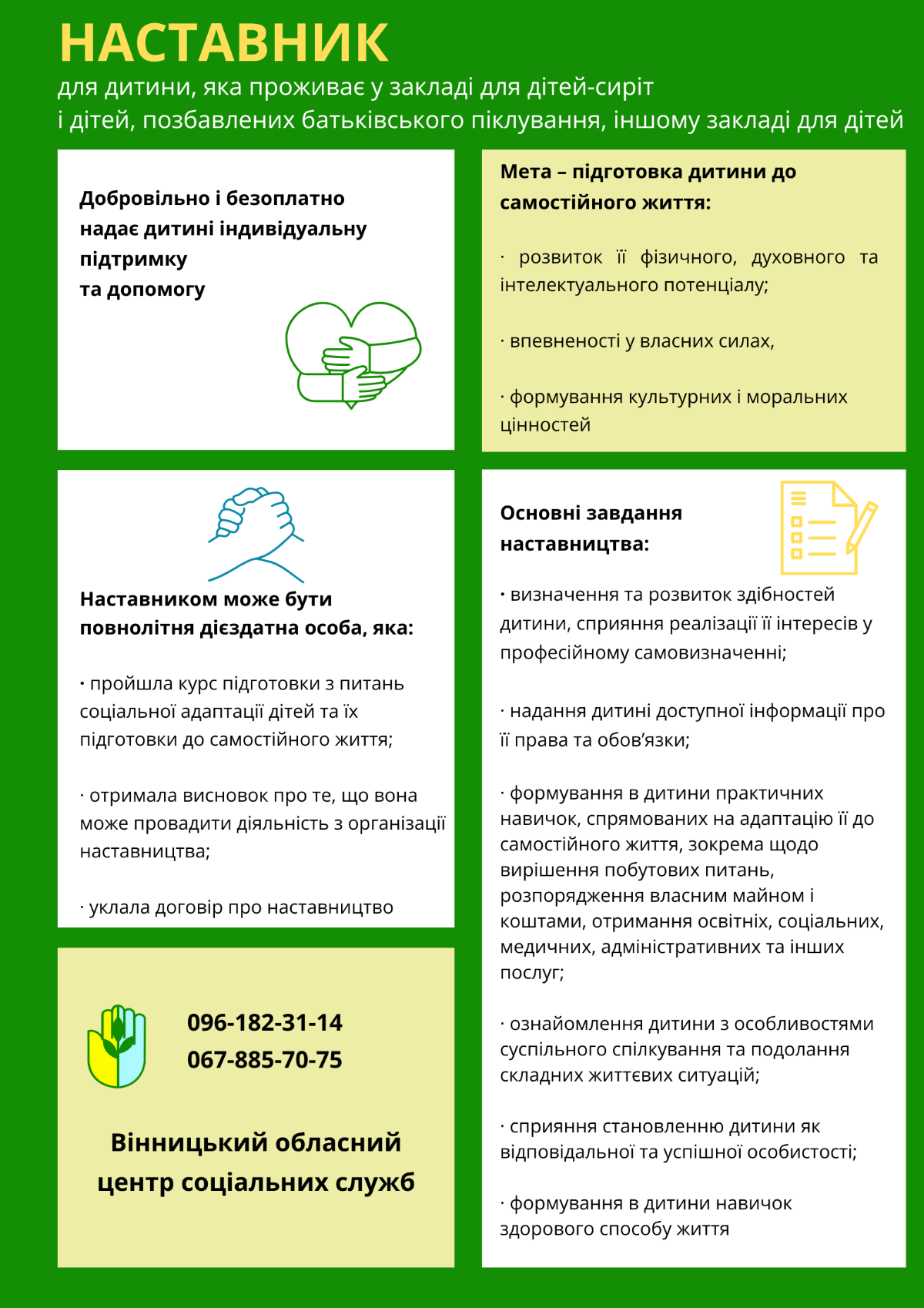 Наставництво над дитиною, яка проживає у закладі для дітей-сиріт і дітей, позбавлених батьківського піклування, іншому закладі для дітей, – це добровільна безоплатна діяльність наставника з надання дитині індивідуальної підтримки та допомоги, насамперед у підготовці до самостійного життя.