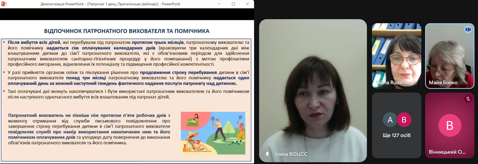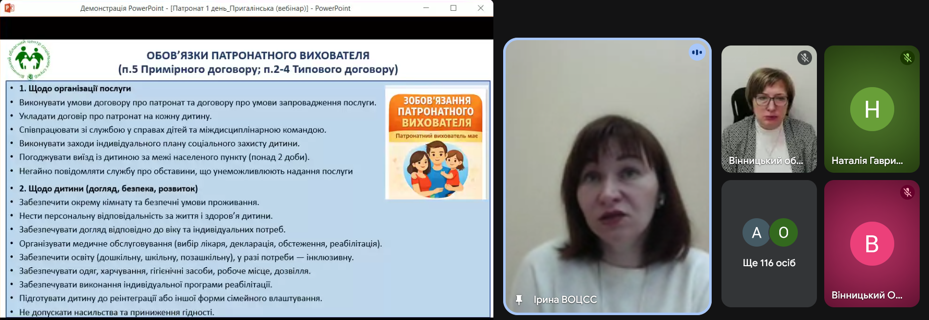 Про це сьогодні під час спільної наради-семінару працівників служб у справах дітей та надавачів соціальних послуг територіальних громад Вінниччини розповіла методистка відділу організації навчальних заходів для сімейних форм виховання обласного центру соціальних служб Ірина Пригалінська.